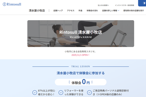 「Rintosull 清水屋小牧店」が11月1日にオープン予定。女性専用のマシンピラティススタジオ(小牧市郷中)