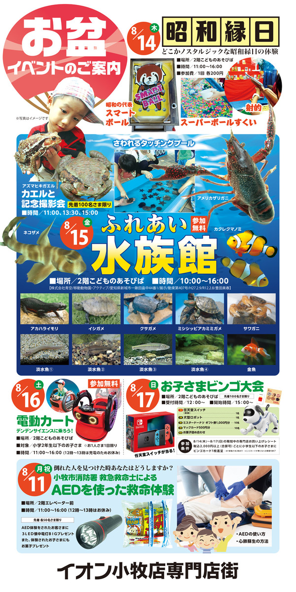 イオン小牧店でお盆イベントが開催されます。 ふれあい水族館や昭和縁日など 日ごとに違うイベントが開催されます。上記のイベントチラシを見て、参···