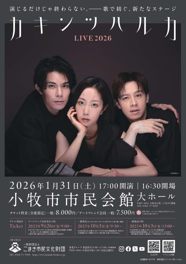 2026年1月31日(土)に小牧市市民会館大ホールにて「カキンツハルカ」のライブが開催されます。 柿澤勇人×ウエンツ瑛士×木南晴夏による音楽ユニット ···